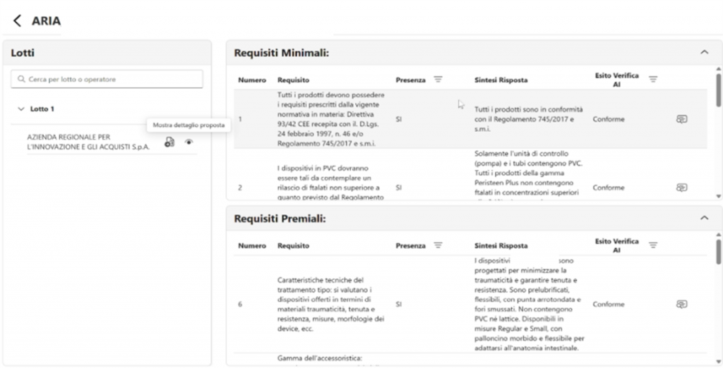 Il sistema, basato su servizi Azure e dotato di funzionalità avanzate di Natural Language Processing e matching semantico, esamina le offerte tecniche presentate dagli operatori economici, confrontando le dichiarazioni contenute nella “dichiarazione di sussistenza” con quanto indicato nelle offerte tecniche.